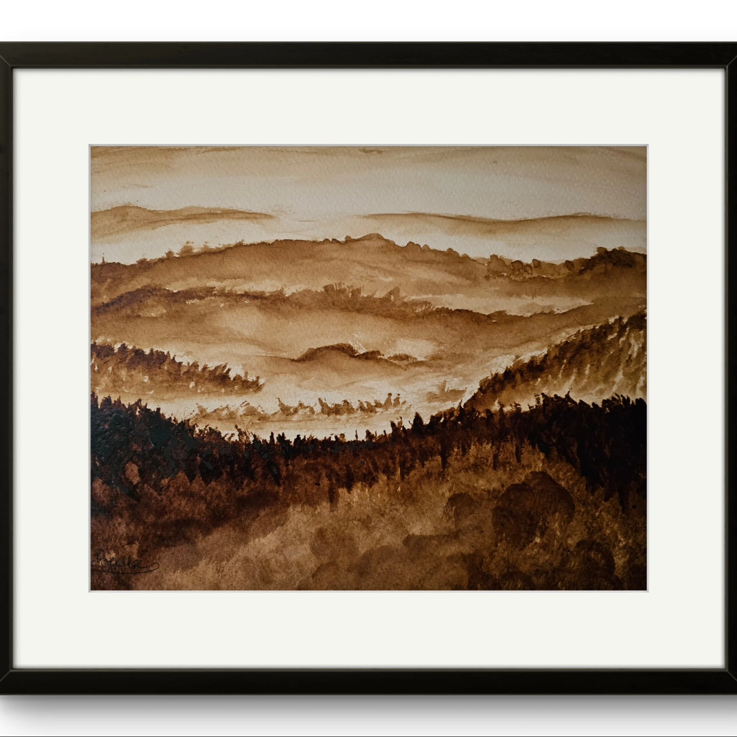 This original coffee painting of the Blue Ridge Mountains is 14x11 inches and matted in a 20x16 in. black gallery frame.